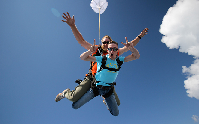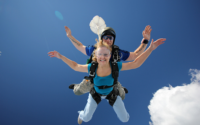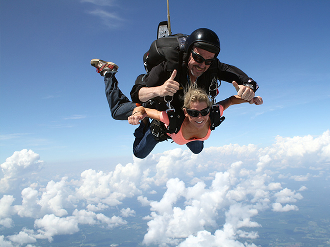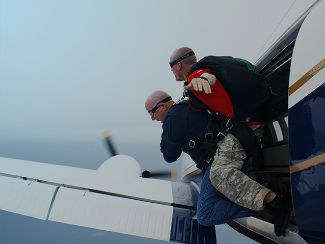 The first jump of your Accelerated FreeFall course involves jumping from approximately 14,000 feet. Two instructors will be with you through the entire experience. You'll be required to respond to hand signals from the instructor, check the altimeter, and practice deploying the parachute (prior to actual deployment). You'll also receive instructions from radio equipment to guide you as you glide to the landing zone. After your first jump through the Alabama sky, the instructor will examine the video and find ways for you to improve all around. If they're satisfied with your performance, congratulations! You are ready for the next level.